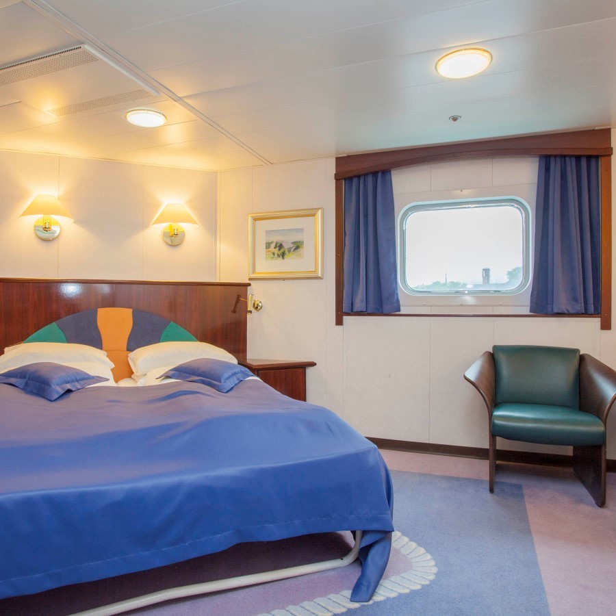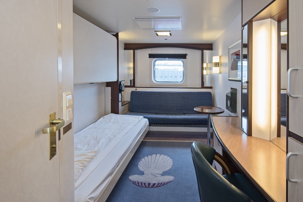 These comfortable, outside cabins for up to two people on the lower deck have bathrooms with shower/WC, and bunk∘ beds, one of which converts into a sofa. The cabins have portholes, some with limited or no view.