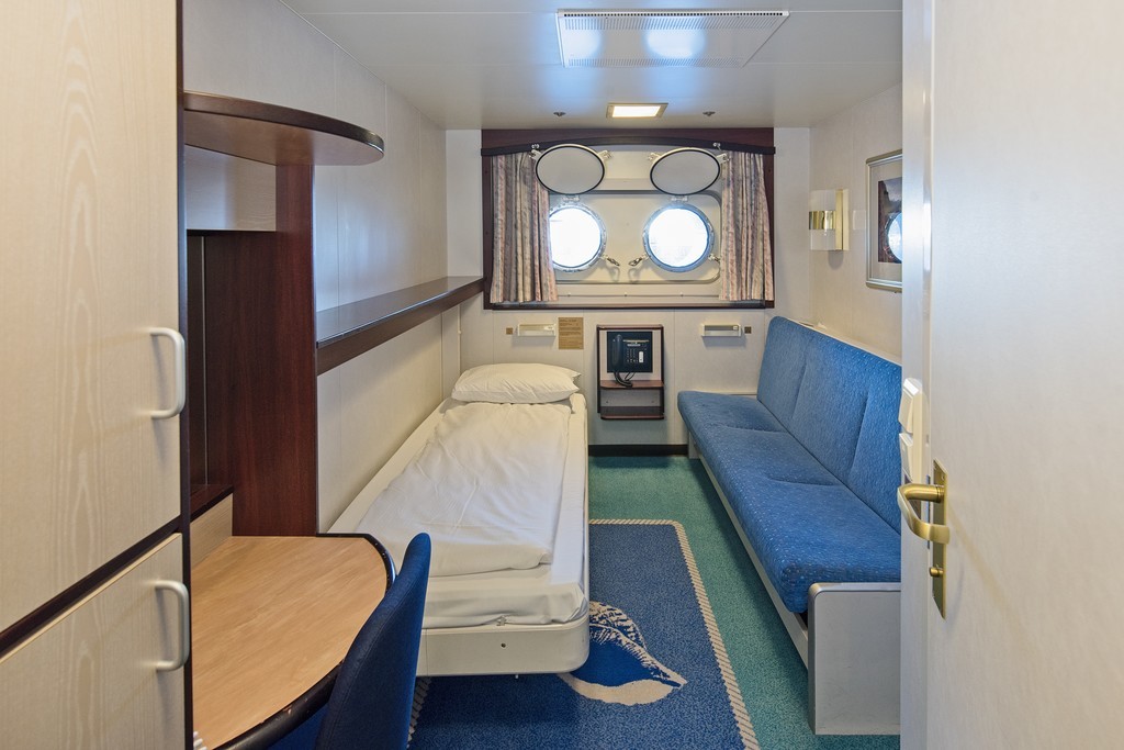 These standard outside cabins for up to three people on the middle decks have bunk beds and separate beds, one of which converts into a sofa, and bathrooms with shower/WC.