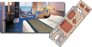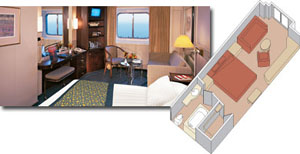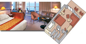 2 lower beds convertible to 1 king-size bed, walk-in closet, bath with tub and shower, two sinks, sitting area, 1 sofa bed, private verandah, refrigerator, floor-to-ceiling windows. * 488 sq. ft. with verandah.