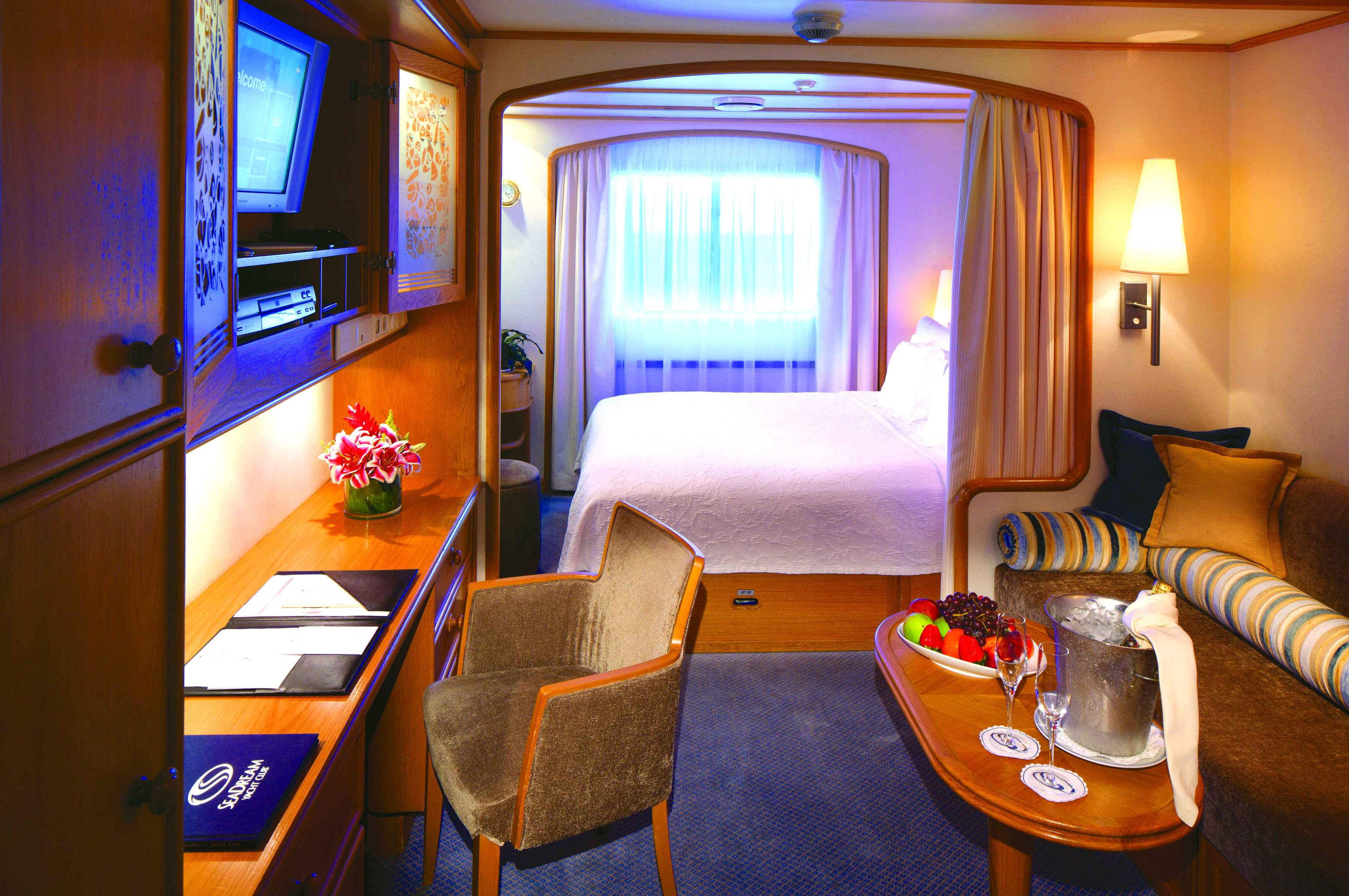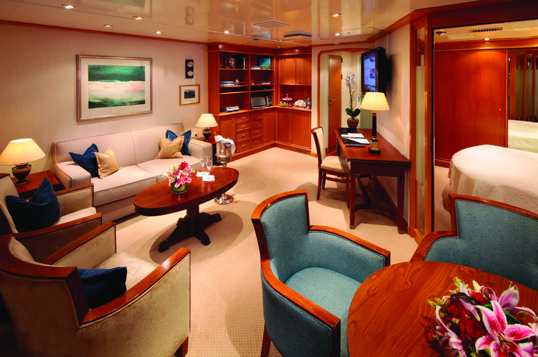 Enjoy 375 sq. ft. / 34.8 sq. meters of living space with ocean views from a total of 3 picture windows. Partitioned living and dining areas with ½ guest bath and closet. Separate and private en-suite master bedroom with permanent queen bed and closet. Marble-lined bathroom with multi-jet shower and soaking tub. Built-in dresser with writing desk. The Admiral Suite is Suite 400 on both yachts and is near the Library.Additional Suite Amenities:Refrigerator stocked with beer, soft drinks, water2 – flat screen TVs & DVD/CD playerNespresso® coffee machineDirect-dial telephoneSafeClimate ControlMake-Up MirrorHair DryerBvlgari® bath amenitiesSelection of superior Belgian bed & bath linensLuxury Bath Robes & SlippersWooden & Padded Silk clothes hangers24-hour in-stateroom “Small Bites” menuWifi Available